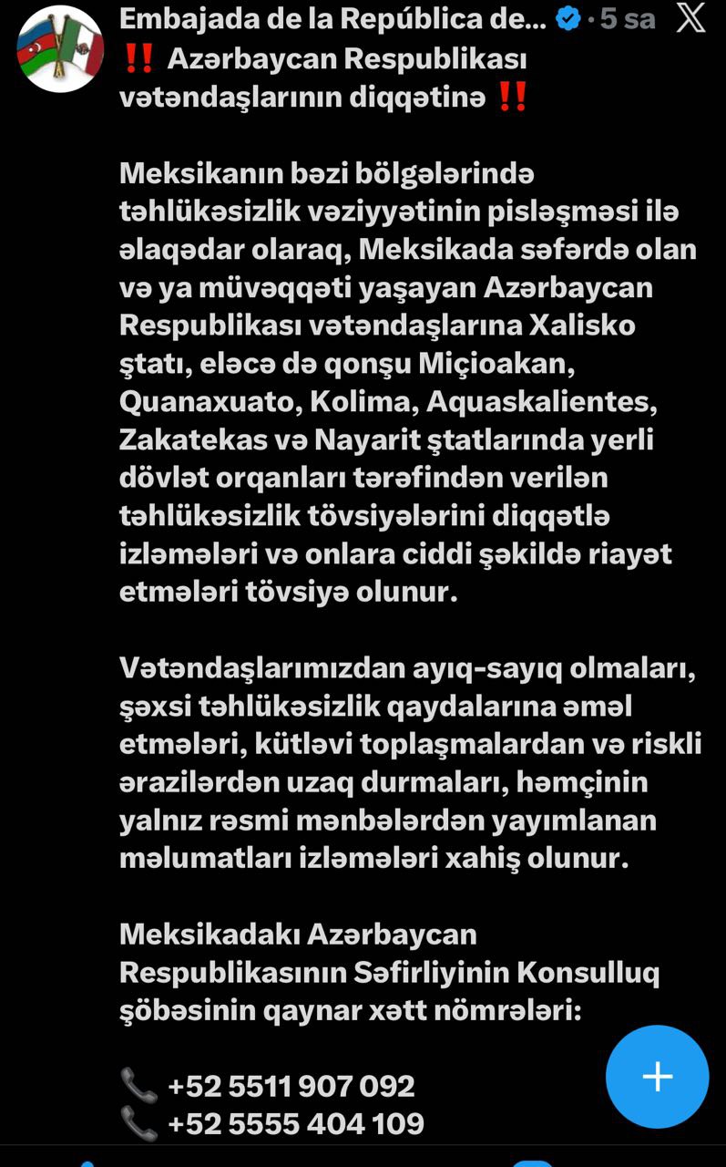 Bildirilib ki, Meksikanın bəzi bölgələrində təhlükəsizlik vəziyyətinin pisləşməsi ilə əlaqədar olaraq bu ölkədə səfərdə olan və ya müvəqqəti yaşayan Azərbaycan vətəndaşlarına Xalisko ştatı, eləcə də qonşu Miçioakan, Quanaxuato, Kolima, Aquaskalientes, Zakatekas və Nayarit ştatlarında yerli dövlət orqanları tərəfindən verilən təhlükəsizlik tövsiyələrini diqqətlə izləmələri və onlara ciddi şəkildə riayət etmələri tövsiyə olunur.