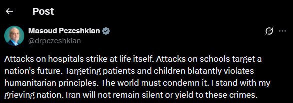 Dünya bunu pisləməlidir. Mən öz kədərli xalqımın yanında dayanmışam. İran bu cinayətlər qarşısında susmayacaq və təslim olmayacaq”,— deyə Pezeşkian qeyd edib.