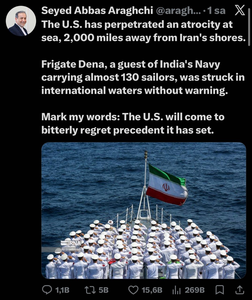 “Təxminən 130 dənizçini daşıyan və Hindistan Hərbi Dəniz Qüvvələrinin qonağı olan “Dena” freqatı beynəlxalq sularda xəbərdarlıq edilmədən vurulub. Sözlərimə diqqət yetirin: ABŞ yaratdığı presedentə görə təəssüf hissi keçirəcək”, - o qeyd edib.