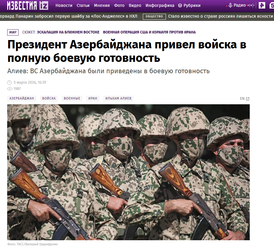 “İzvestiya” qəzetinin “İlham Əliyev qoşunların döyüş hazırlığı vəziyyətinə gətirilməsi əmrini verib” sərlövhəli məqaləsində bildirilir ki, İran ərazisindən Azərbaycanın Naxçıvan bölgəsinə dron hücumu ilə bağlı Təhlükəsizlik Şurasının iclasını keçirən Azərbaycan Prezidenti deyib: “Bizim Silahlı Qüvvələrimiz - Müdafiə Nazirliyi, Dövlət Sərhəd Xidməti, digər bütün Xüsusi Təyinatlı Qüvvələr bir nömrəli səfərbərlik vəziyyətinə gətirilib və istənilən əməliyyatı keçirməyə hazır olmalıdırlar”. Diqqətə çatdırılıb ki, dövlət başçısı İranın bu addımını “Azərbaycan dövlətinə qarşı terror aktı” adlandırıb və Tehranın məsuliyyət daşıdığını bildirib. Prezident vurğulayıb: “Bu gün İran tərəfindən Azərbaycan ərazisinə qarşı, Azərbaycan dövlətinə qarşı terror aktı törədilmişdir”.