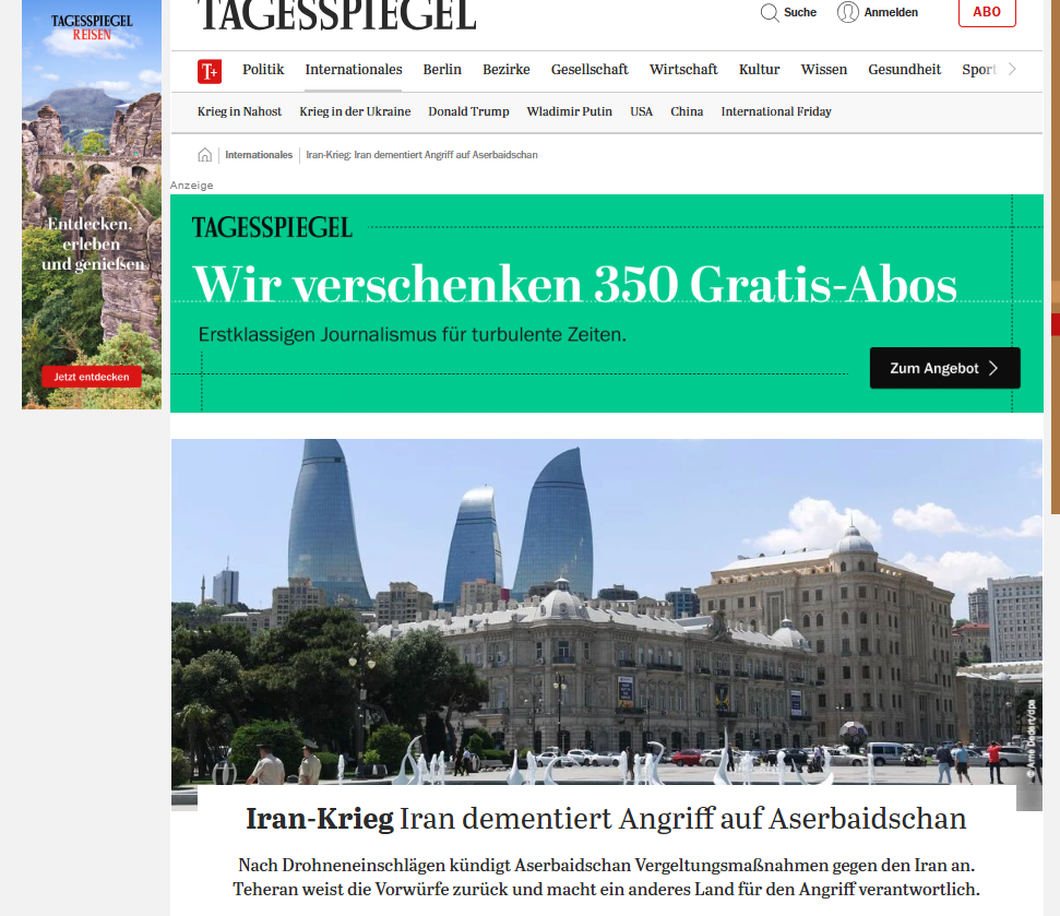 “Morgenpost”, “Börsen News”, “FLZ. News”, Tagesspiegel”, “Frankfurter Rundschau”, “Wirthschau Woche”, “Die Zeit”, “Ad Hoc News”, Cash”, Sarganserlander”, “Ostfriezen Zeitung” qəzet və portallarının materiallarında Azərbaycanın Naxçıvan Muxtar Respublikasında aeroportun, məktəb binasının və digər mülki obyektlərin dron hücuma məruz qaldığı diqqətə çatdırılıb.