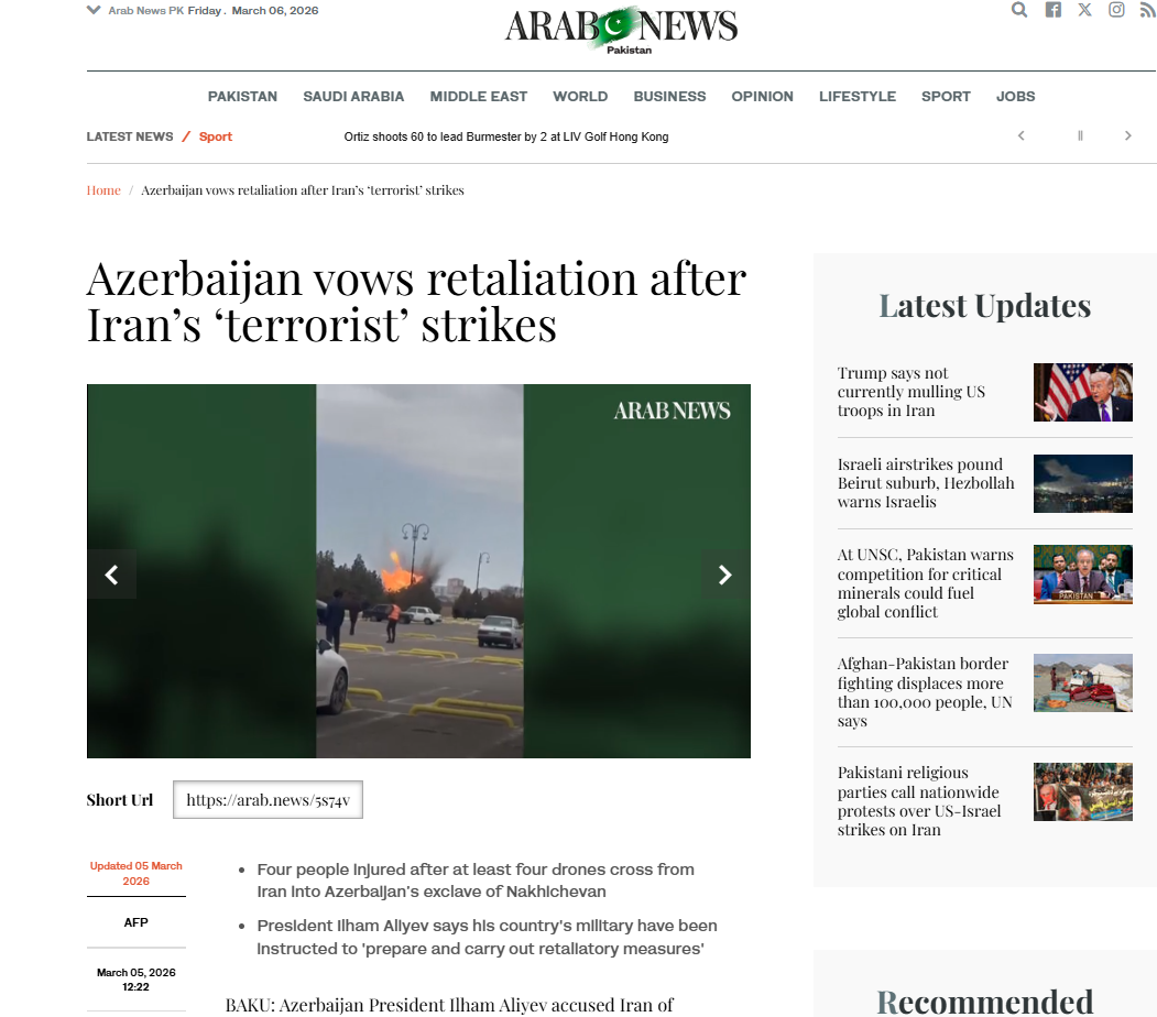 Səudiyyə Ərəbistanının “Arab News” qəzetində dərc olunan məqalədə qeyd olunub ki, Azərbaycan Prezidenti İlham Əliyev cümə axşamı günü dörd nəfərin yaralanması ilə nəticələnən dron hücumlarından sonra İranı “terror aktı” törətməkdə ittiham edib. Materialda deyilir: “Bakı bildirib ki, günorta hücumları Azərbaycanın İranla həmsərhəd olan Naxçıvan anklavına daxil olan ən azı dörd pilotsuz təyyarə ilə bağlı olub. Prezident Əliyev təcili çağırılan Təhlükəsizlik Şurasının iclasında deyib: