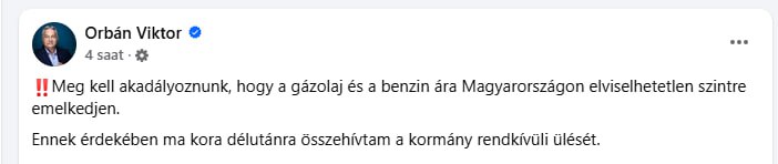 "Biz Macarıstanda qaz, neft və benzin qiymətlərinin dözülməz səviyyələrə qalxmasının qarşısını almalıyıq. Bu məqsədlə mən bu axşam hökumətin təcili iclasını çağırıram", - deyə o bildirib.