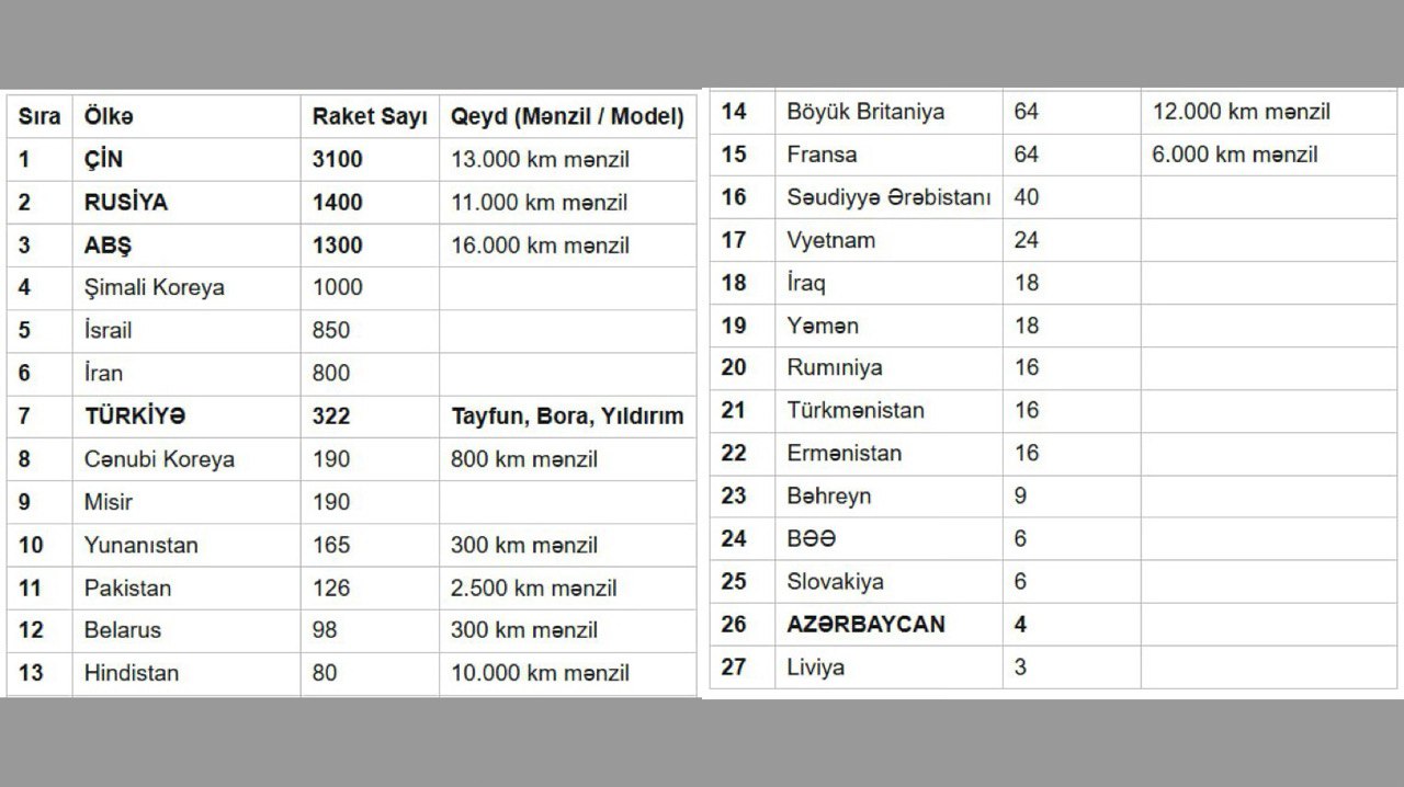 Azərbaycan isə 4 ədəd rəsmi qeydə alınmış ballistik raket sistemi ilə siyahının 26-cı pilləsində qərarlaşıb.