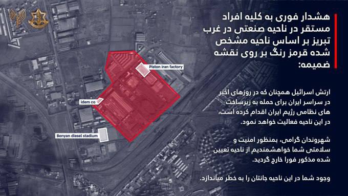 İsral ordusu son günlər Tehran ətrafında İran rejiminin hərbi infrastrukturuna zərbələr endirdiyi kimi, yaxın saatlarda Təbriz şəhərinin qərbində yerləşən sənaye zonasında da əməliyyatlar keçirəcəyini açıqlayıb.