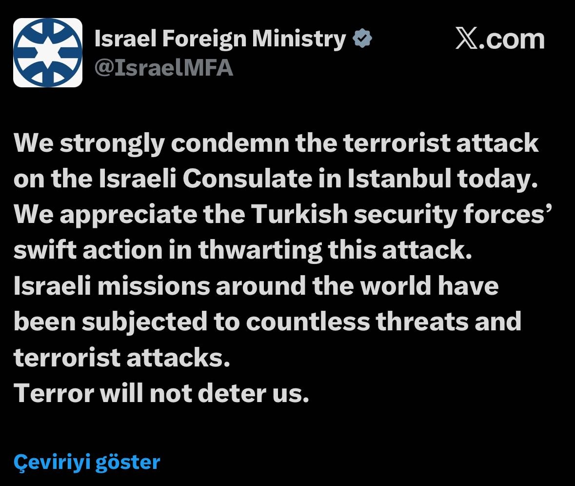 “Bu gün İstanbulda İsrail konsulluğuna qarşı terror aktını şiddətlə qınayırıq. Türkiyənin təhlükəsizlik qüvvələrinin bu hücumun qarşısını almaq üçün operativ tədbirlərini yüksək qiymətləndiririk. Dünya üzrə İsrail nümayəndəlikləri saysız-hesabsız təhdidlərə və terror hücumlarına məruz qalıb. Terror bizi qorxutmayacaq”, - məlumatda qeyd olunub.