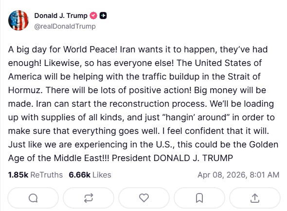"Dünya Sülhü üçün böyük bir gün! İran bunun baş verməsini istəyir, onlar artıq cana doyublar! Eynilə digər hər kəs də!", - Tramp vurğulayıb və əlavə edib ki, Amerika Birləşmiş Ştatları Hörmüz boğazındakı nəqliyyat sıxlığı ilə bağlı kömək edəcək: