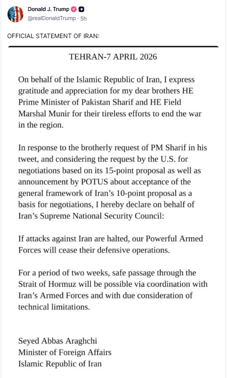 "İran İslam Respublikası adından bölgədəki müharibəyə son qoymaq üçün göstərdikləri yorulmaz səylərə görə əziz qardaşlarım, Pakistanın Baş Naziri Şərifə və Feldmarşal Munirə təşəkkür və minnətdarlığımı bildirirəm".