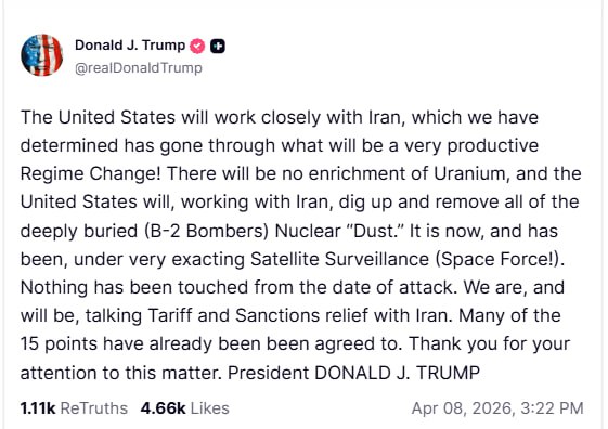 “ABŞ İranla yaxından işləyəcək. Hansı ki, bizim fikrimizcə, orada çox məhsuldar rejim dəyişikliyi verib. Uranın zənginləşdirilməsi olmayacaq və ABŞ İranla birlikdə işləyərək dərin basdırılmış nüvə tozlarını çıxarıb ləğv edəcək. O, çox dəqiq peyk nəzarətində olub və indi də belədir.