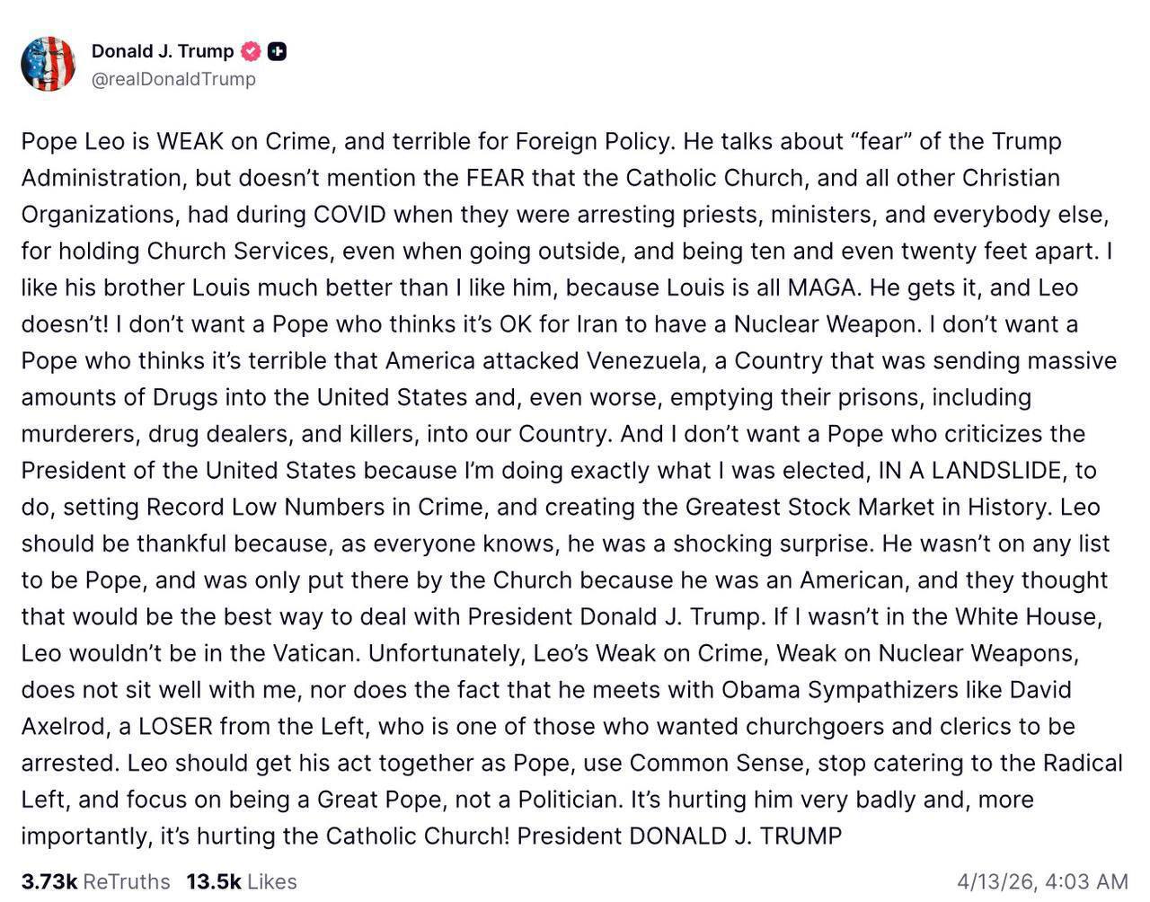 Tramp yazıb ki, pontifikin İran və Venesuela ilə bağlı mövqeyi ilə razılaşmır. Onun sözlərinə görə, İranın nüvə silahına sahib olmasını məqbul hesab edən və ABŞ-ın Venesuelaya qarşı addımlarını tənqid edən Papa ilə razılaşmaq mümkün deyil. Prezident, həmçinin ABŞ administrasiyasına qarşı tənqidləri qəbul etmədiyini bildirib.