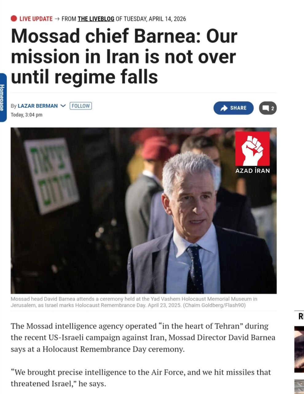 "Mossad" rəhbəri: "İrandakı missiyamız rejim devrilənə qədər davam edəcək" - FOTO