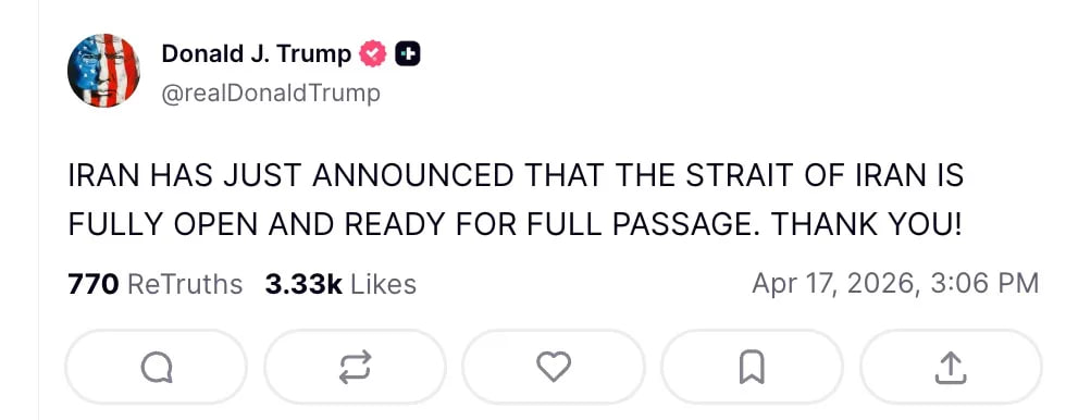 "İran indicə elan etdi ki, İran boğazı tamamilə açıqdır və sərbəst keçid üçün hazırdır. Sağ olun!"