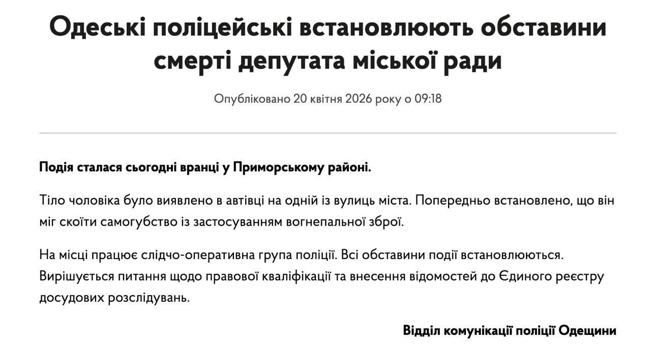 Bizim.Media xəbər verir ki, Odessa vilayət polisi hadisənin bu gün səhər Primorski rayonunda qeydə alındığını bildirib.