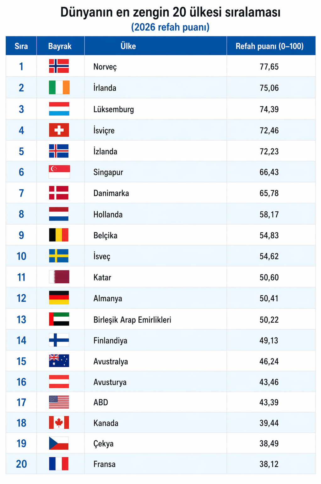 2026-cı il “Rifah İndeksi” tərəfindən təqdim olunan cədvəl göstərir ki, "zəngin ölkə" anlayışı tədricən dəyişir. Buna görə, sərvət artıq yalnız nə qədər istehsal olunduğu ilə deyil, həm də həmin sərvətin nə qədər ədalətli şəkildə bölüşdürülməsi, sosial birliyi nə qədər gücləndirməsi və insanların həyatına nə qədər təsir etməsi ilə müəyyən edilir.