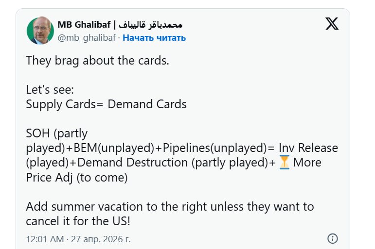 Bizim.Media xəbər verir ki, Qalibaf “X” hesabında İran və ABŞ arasında enerji rıçaqlarını əks etdirən “iqtisadi kart modeli” paylaşıb.
