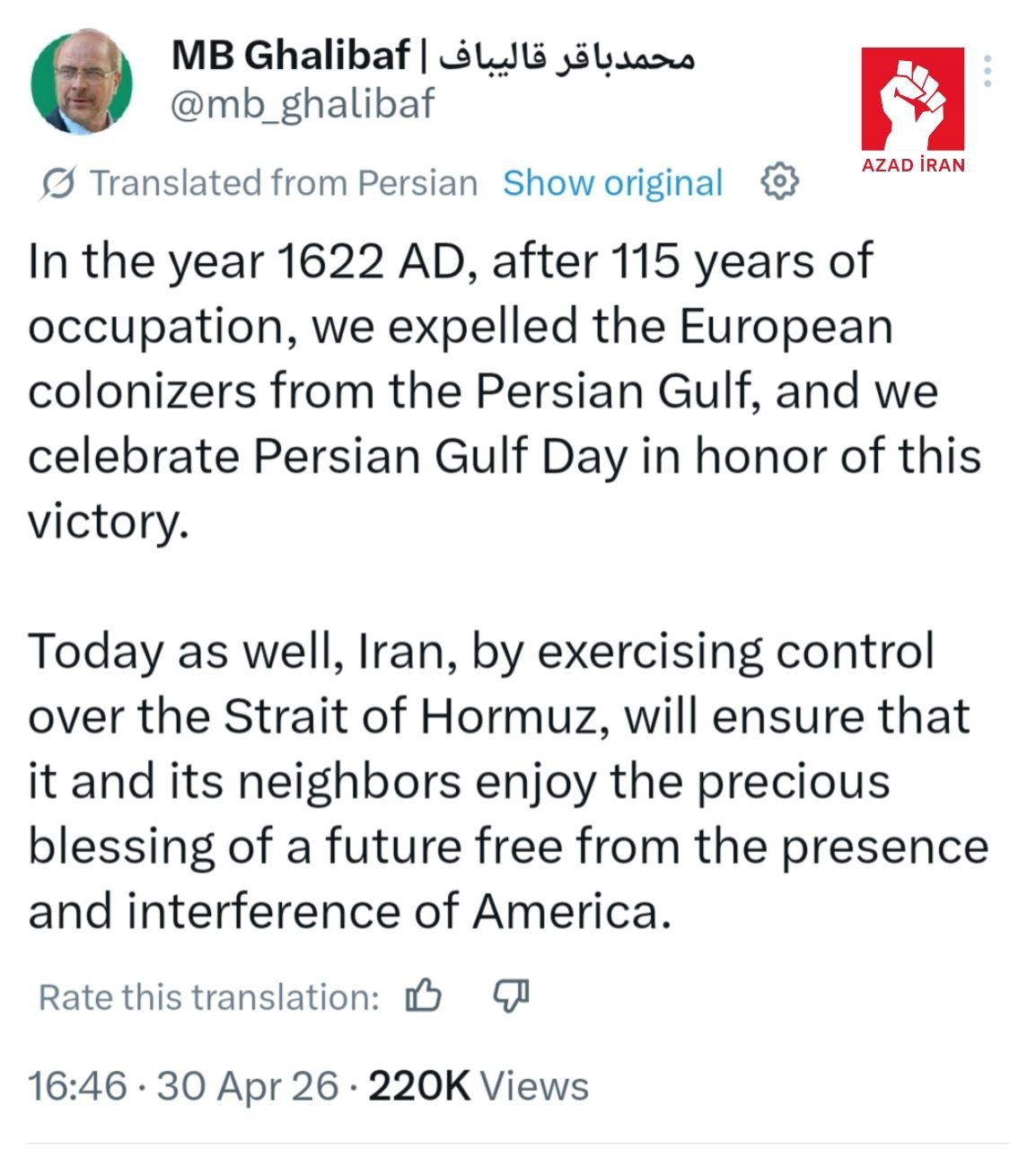 “1622-ci ildə Avropa müstəmləkəçiləri 115 illik işğaldan sonra Fars körfəzindən qovuldular".