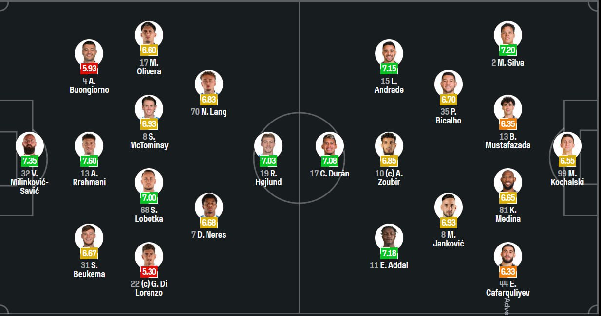 “Napoli: Saviç Milinkoviç, Allessando Buongiorno, David Neres, Skot Maktominey, Amir Rraxmani, Matias Olivera, Rasmus Heylunn, Covanni Di Lorenso (k), Sem Baukema, Stanislav Labotka, Noa Lanq
