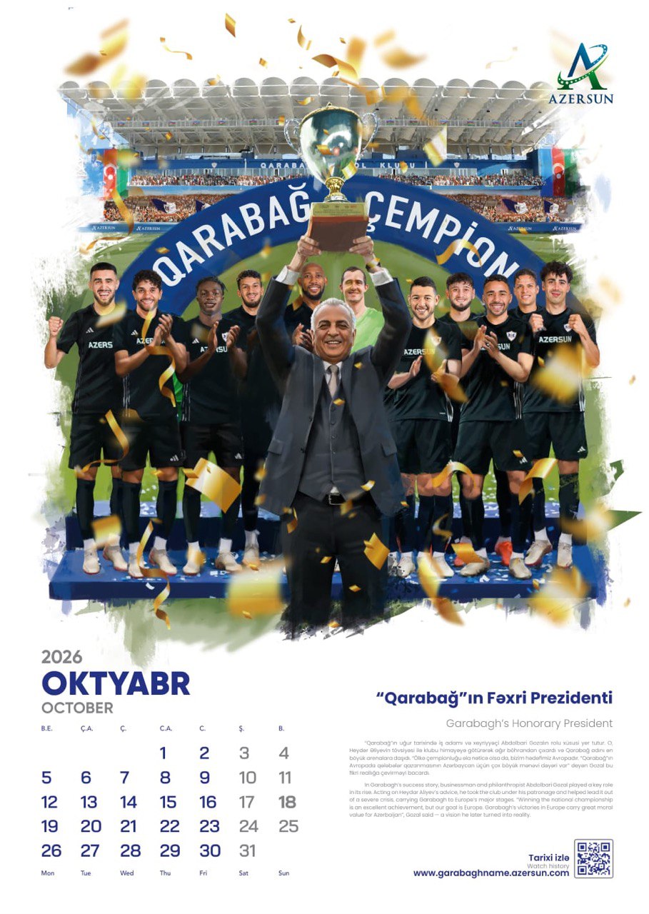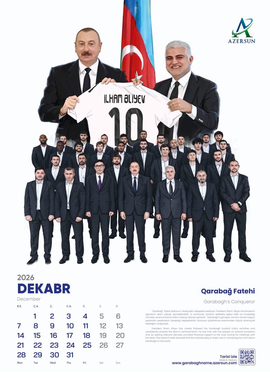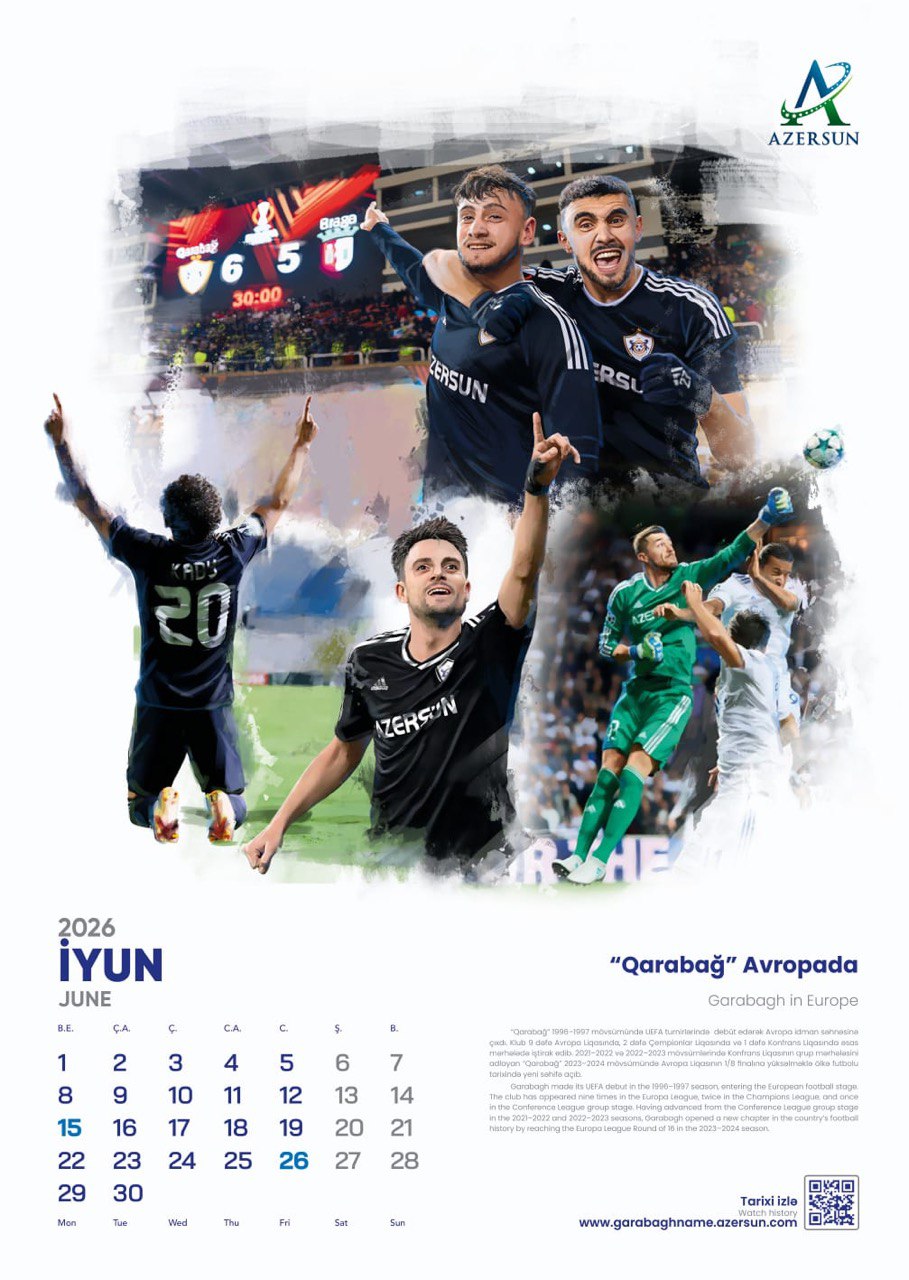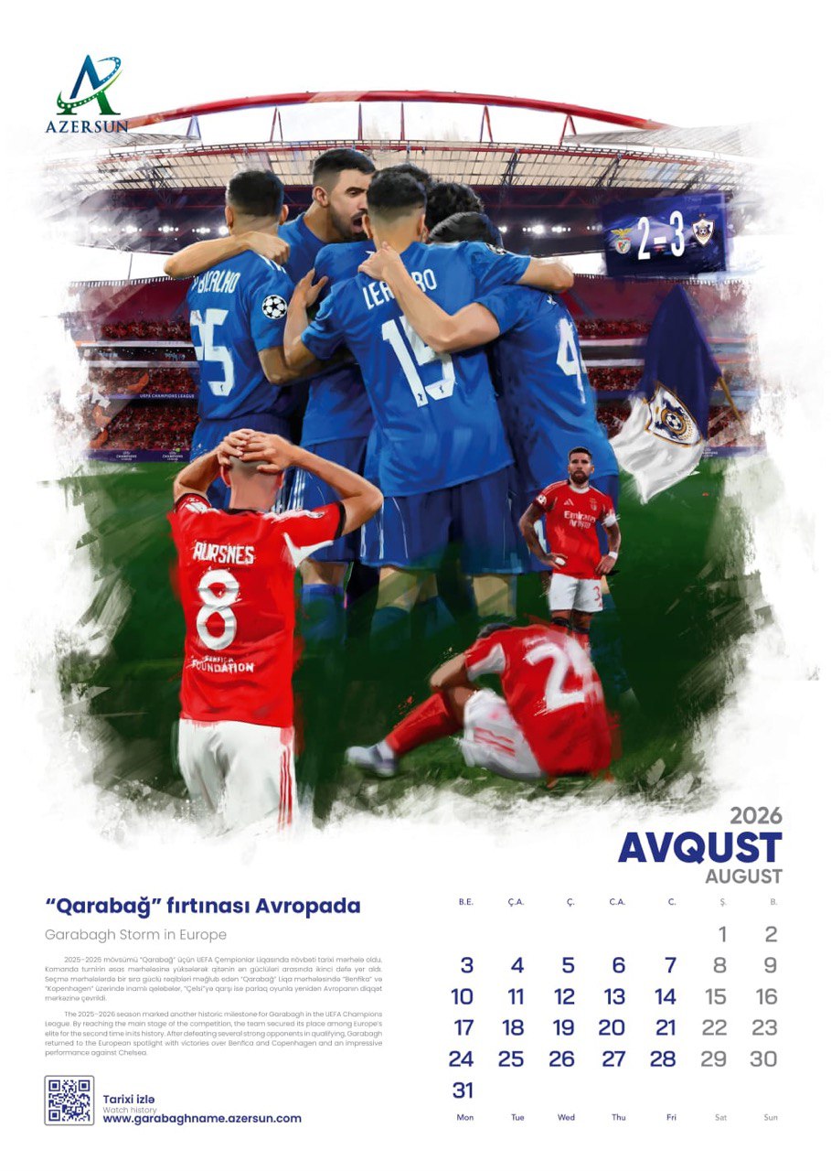 Bizim.Media xəbər verir ki, 2026-cı il üçün hazırlanan bu təqvim son illərdə futbol sahəsində qızıl dövrünü yaşayan “Qarabağ” futbol klubuna həsr olunub.