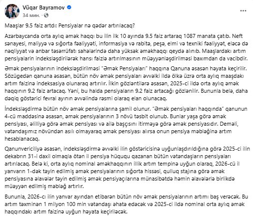 "Belə ki, orta aylıq nominal əməkhaqqının illik artım tempinə uyğun olaraq, 2026-cü il yanvarın 1-dək təyin edilmiş əmək pensiyalarının sığorta hissəsi, qulluq stajına görə əmək pensiyasına əlavələr təyin edilmiş əmək pensiyaçılarına münasibətdə həmin əlavələrlə birlikdə müəyyən edilmiş məbləğ artırılır. Bununla, 2026-cı ilin yanvar ayından etibarən bütün növ əmək pensiyalarının artımı baş verəcək. Bu artım təxminən 1 milyon 100 min vətəndaşı əhatə edəcək və 2025-ci ildə nominal orta aylıq əməkhaqqındakı artım faizinə uyğun həyata keçiriləcək".