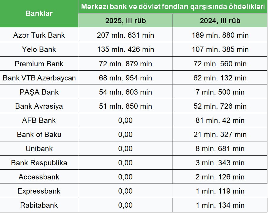 2025-ci ilin yanvar-sentyabr aylarında bankların mərkəzi bank və dövlət fondları qarşısında öhdəlikləri cədvəldəki kimi olub: