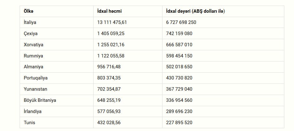 Yanvar-noyabr ayları üzrə ən çox Azərbaycan neftini idxal edən ölkələrin ilk üçlüyündə birinci yerdə İtaliya (13,1 milyon ton, 6,7 milyard dollar) yer alır, ardınca Çexiya (1,4 milyon ton, 742,2 milyon dollar) və Xorvatiya (1,3 milyon ton, 666,6 milyon dollardan çox) gəlir.