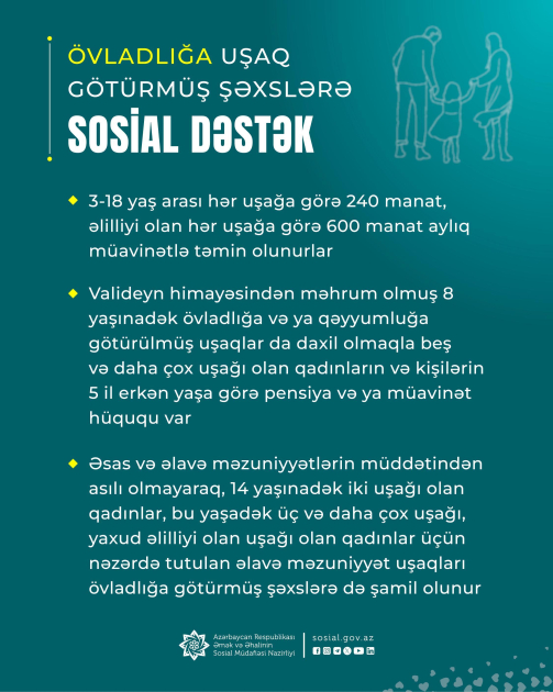 Övladlığa uşaq götürmüş şəxslər aylıq sosial müavinətlə (3-18 yaşarası hər uşağa görə 240 manat, əlilliyi olan hər uşağa görə 600 manat) təmin edilməklə yanaşı, onlar sosial təminat, əmək, vergi münasibətləri sahələrində bir sıra güzəştlərə malikdirlər.