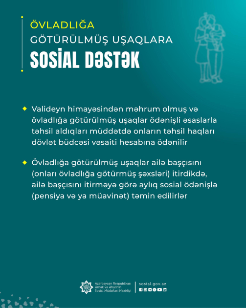 - eyni zamanda, övladlığa götürülmüş uşaqlar ailə başçısını (onları övladlığa götürmüş şəxsləri) itirdikdə, ailə başçısını itirməyə görə aylıq sosial ödənişlə (pensiya və ya müavinət) təmin edilirlər. Habelə valideyn himayəsindən məhrum olmuş və övladlığa götürülmüş uşaqlar ödənişli əsaslarla təhsil aldıqları müddətdə onların təhsil haqları dövlət büdcəsi vəsaiti hesabına ödənilir.