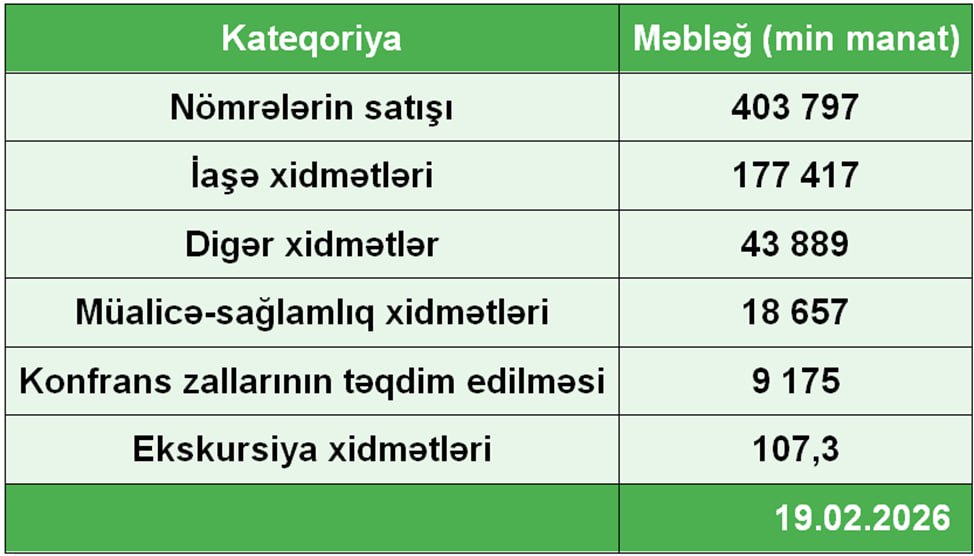 2025-ci ildə ölkədə fəaliyyət göstərən hotel və mehmanxana tipli obyektlərin ümumi gəliri 653 milyon 44 min manat təşkil edib.