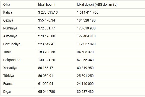 Bu ilin yanvar-mart aylarında Azərbaycandan ən çox neft idxal edən ölkələrin ilk üçlüyünə İtaliya (3,273 milyon ton, 1,614 milyard dollar), Çexiya (355,5 min ton, 184,3 milyon dollar) və Rumıniya (372 min ton, 178,6 milyon dollardan çox) daxil olub.