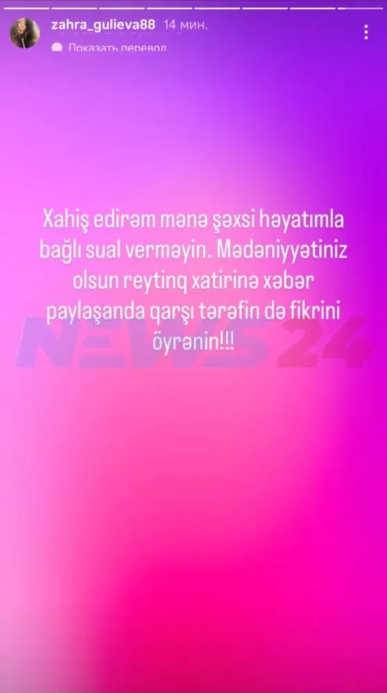 “Xahiş edirəm mənə şəxsi həyatımla bağlı sual verməyin. Mədəniyyətiniz olsun, reytinq xatirinə xəbər paylaşanda qarşı tərəfin fikrini öyrənin,” – deyə Zəhra Quliyeva bildirib.
