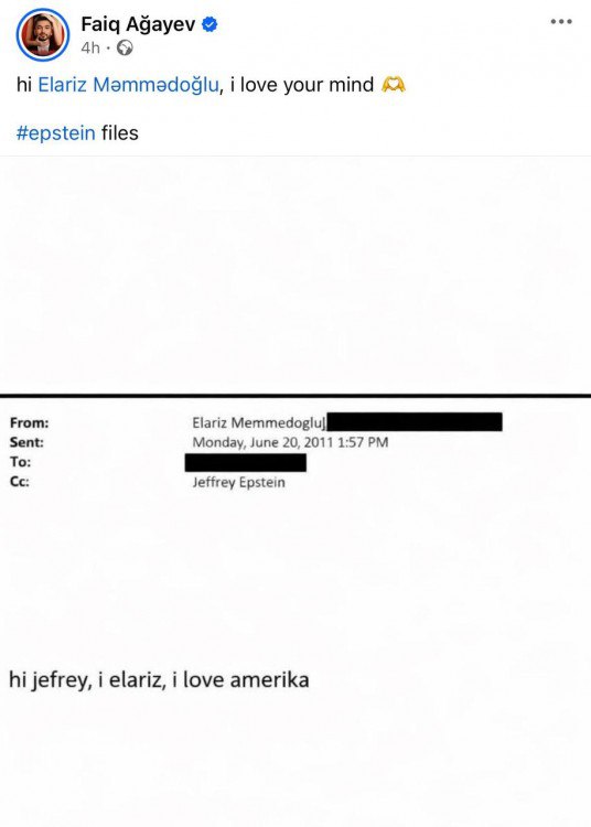 Bizim.Media  xəbər verir ki, paylaşımda Elarizin onlarla azyaşlı qızın istismar edildiyi şəbəkə ilə bağlı ittiham olunan milyarder Ceffri Epşteynə yazdığı elektron məktub yer alıb.