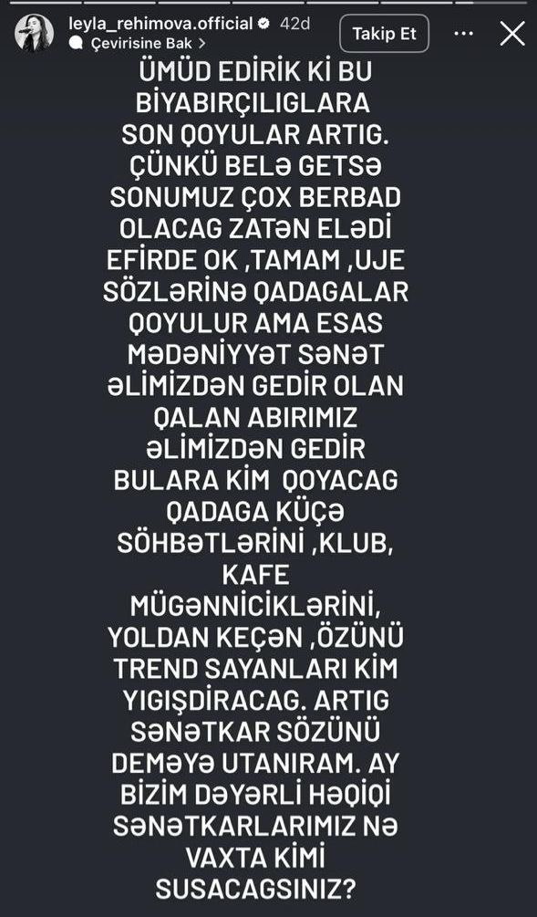 Olan-qalan abırımız əlimizdən gedir. Bunlara kim qoyacaq qadağa? Küçə söhbətlərini, klub, kafe müğənniciklərini, yoldan keçən, özünü trend sayanları kim yığışdıracaq? Artıq sənətkar sözünü deməyə utanıram. Ay bizim dəyərli, həqiqi sənətkarlarımız, nə vaxta kimi susacaqsınız?”