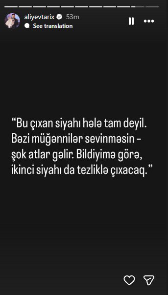 "Bu çıxan siyahı hələ tam deyil. Bəzi müğənnilər sevinməsin. Bildiyimə görə, ikinci siyahı da tezliklə çıxacaq" - deyə paylaşımda qeyd olunub.