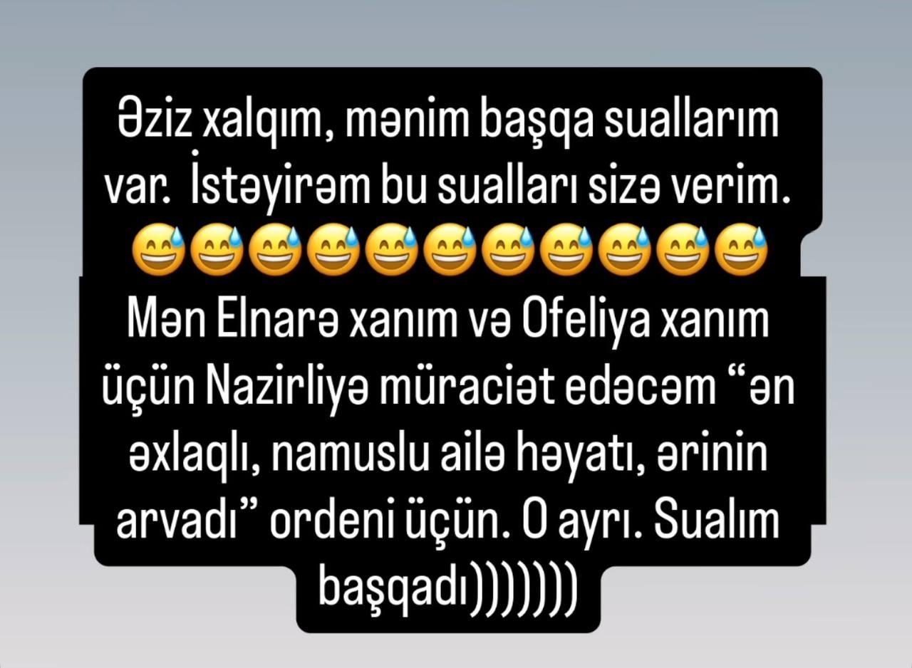 "Əziz xalqım, mənim başqa suallarım var. İstəyirəm bu sualları sizə verim. Elnarə Abdullayeva və Ofeliya Şabanova üçün nazirliyə müraciət edəcəyəm: “ən əxlaqlı, namuslu ailə həyatı, ərinin arvadı” ordeni üçün. O başqa məsələ...