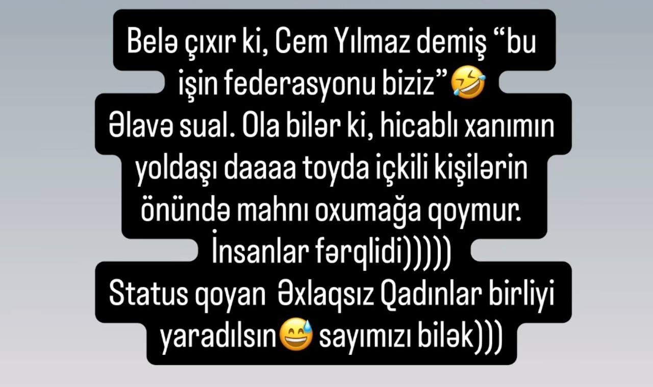Bir dostum var, ona görə soruşuram. Belə çıxır ki, Cem Yılmaz demiş “bu işin federasyonu biziz?”. Əlavə sual. Ola bilər ki, hicablı xanımın yoldaşı da toyda içkili kişilərin önündə mahnı oxumağa qoymur. İnsanlar fərqlidir".