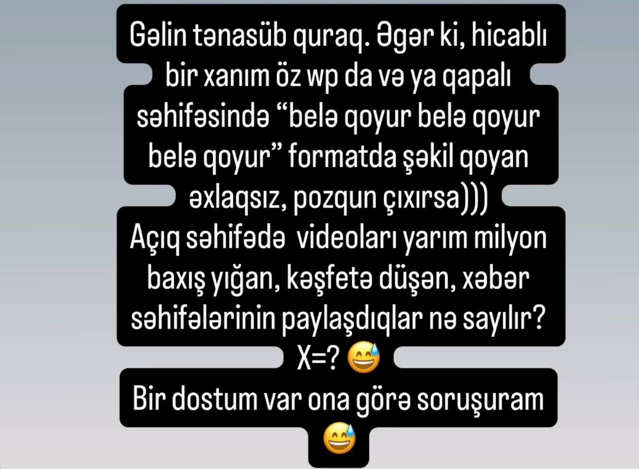 Sualım başqadır: Gəlin tənasüb quraq. Əgər ki, hicablı bir xanım öz vatsapında və ya qapalı səhifəsində (belə qoyur, belə qoyur, belə qoyur) şəkil qoyursa və əxlaqsız, pozqun çıxırsa, açıq səhifədə videoları yarım milyon baxış yığan, xəbər səhifələrinin paylaşdıqlar nə sayılır?