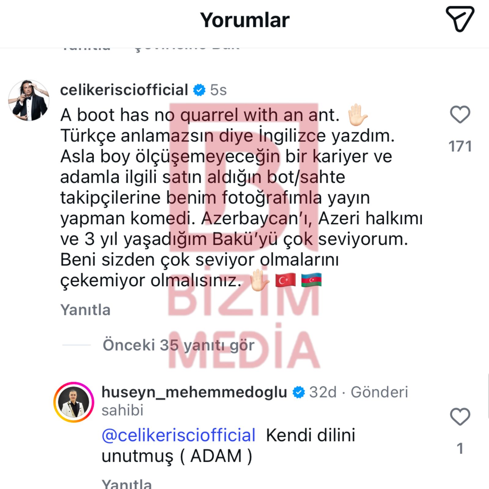 “Çəkmənin qarışqa ilə heç bir davası olmaz. Türkcə anlamayacağını düşündüyüm üçün ingiliscə yazdım. Heç vaxt boy ölçüşə bilməyəcəyin bir karyera və insan haqqında, satın aldığın saxta izləyicilərlə mənim şəkilimdən istifadə edərək paylaşım etməyin gülüncdür. Azərbaycanı, azərbaycanlıları və 3 il yaşadığım Bakını çox sevirəm. Məni sizdən daha çox sevmələrini həzm edə bilmirsiniz, deyəsən?!"
