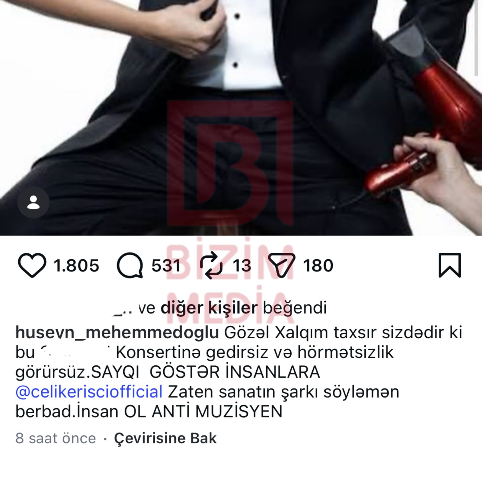 Bizim.Media xəbər verir ki, buna səbəb Hüseynin Çelikin Heydər Əliyev Sarayında baş tutan konsertindən sonrakı paylaşımı olub.