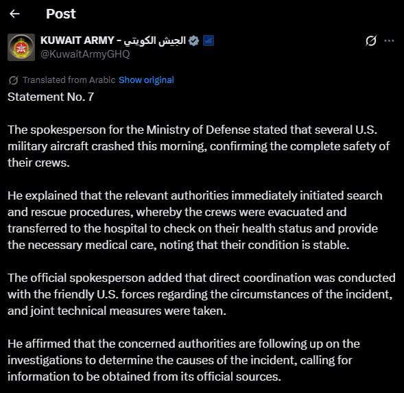Bizim.Media xəbər verir ki, bu barədə Küveyt Müdafiə Nazirliyinin məlumatında qeyd olunub.