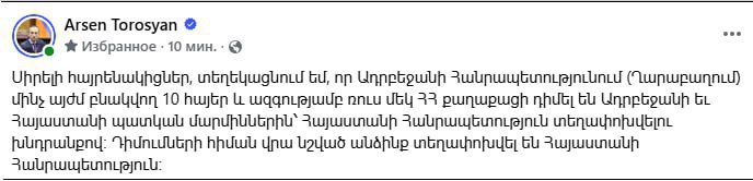 “Bu günə qədər Qarabağda (Azərbaycan Respublikası) yaşayan 10 erməni və rus milliyyətindən olan bir Ermənistan vətəndaşı Azərbaycan və Ermənistanın aidiyyəti orqanlarına müraciət edərək Ermənistana köçmək istədiklərini bildiriblər. Müraciətlər əsasında həmin şəxslər Ermənistan Respublikasına köçürülüb”, – deyə Arsen Torosyan yazıb.