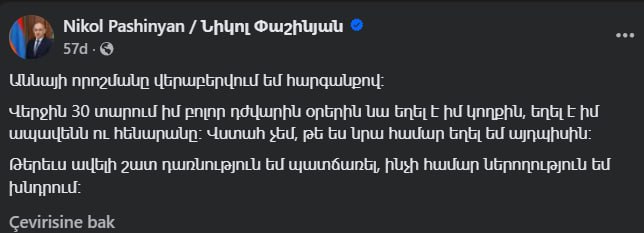 "Mən Annanın qərarına hörmətlə yanaşıram. Son 30 il ərzində bütün çətin günlərimdə o, mənim yanımda olub, mənim dayağım və dəstəyim olub. Əmin deyiləm ki, mən də onun üçün eyni olmuşam. Ola bilsin ki, mən ona daha çox acı yaşatmışam, bunun üçün üzr istəyirəm", - Paşinyan yazıb.