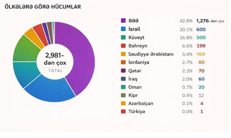 Açıqlanan məlumatlara görə, bu müddətdə 2981-dən çox zərbə və hücum epizodu qeydə alınıb. Lakin diqqət çəkən əsas məqam odur ki, hücumların böyük hissəsi İranın uzun illərdir əsas düşmən kimi təqdim etdiyi İsrailə deyil, regionun digər dövlətlərinə yönəlib.