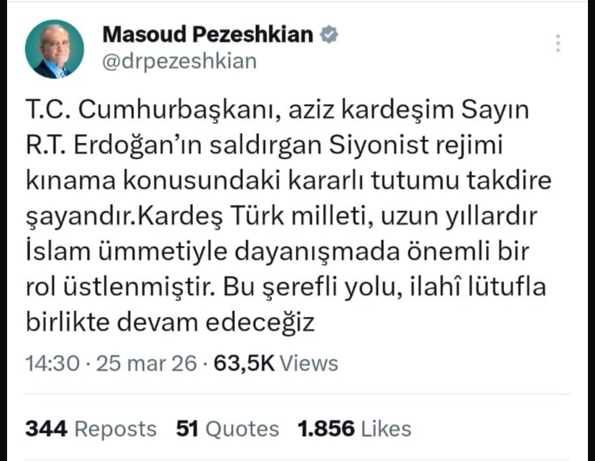 İran Prezidenti Məsud Pezeşkian regionda davam edən böhran fonunda tutduğu mövqeyə görə Türkiyə Prezidenti Rəcəb Tayyib Ərdoğana təşəkkür edib.