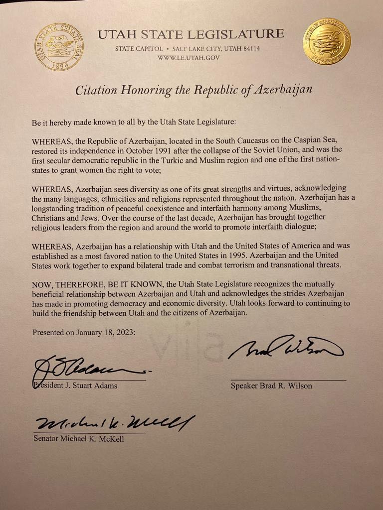 Konqres Azərbaycan Respublikası ilə bağlı bəyanat qəbul edib. Sənəddə Azərbaycanın türk və müsəlman dünyasında ilk dünyəvi demokratik respublika və qadınlara seçki hüququ verən ilk ölkələrdən olması, habelə ölkəmizdə sülh şəraitində birgə yaşayış və dinlərarası harmoniyanın ən yüksək səviyyədə təmin edilməsi, ABŞ və Yuta ştatı ilə Azərbaycan arasında sıx münasibətlərin mövcudluğu və Azərbaycanın demokratiya və iqtisadi müxtəlifliyi təşviq etməsi vurğulanıb.