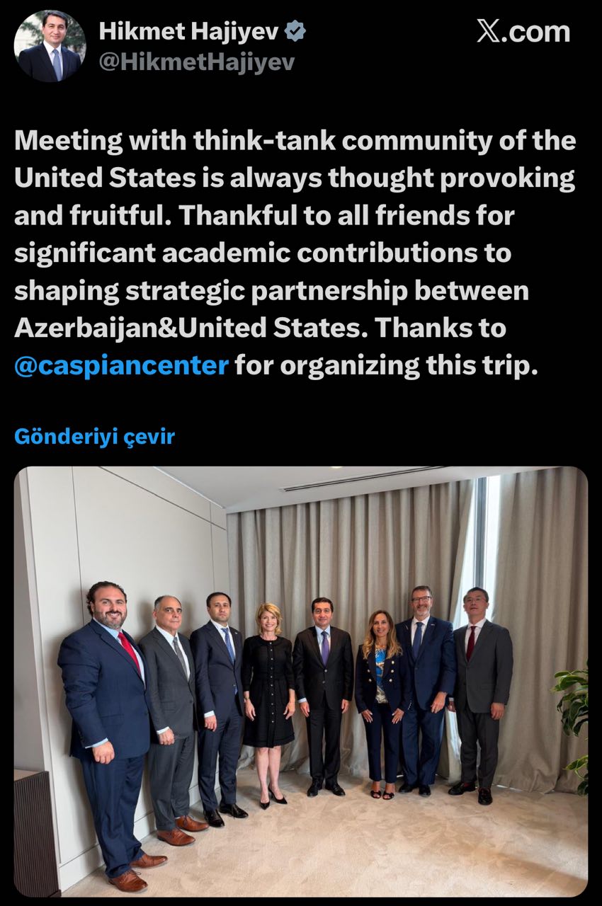 “Birləşmiş Ştatların beyin mərkəzlərinin nümayəndələri ilə görüş həmişə həm düşündürücü, həm də faydalı olur. Azərbaycan və Amerika Birləşmiş Ştatları arasında strateji tərəfdaşlığın inkişafına verdikləri dəyərli akademik töhfələrə görə bütün dostlara təşəkkür edirəm. Bu səfərin təşkilinə görə “Caspian Center”ə minnətdarlığımı bildirirəm”, - deyə H. Hacıyev görüşlə bağlı yazıb.