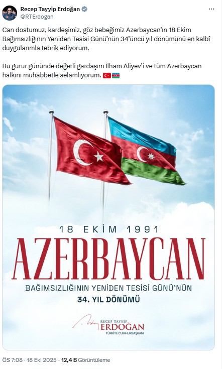 "Can dostumuz, qardaşımız, göz bəbəyimiz Azərbaycanın 18 Oktyabr - Müstəqilliyinin Bərpası Gününü ürəkdən təbrik edirəm. Bu qürurlu gündə dəyərli qardaşım İlham Əliyevə və bütün Azərbaycan xalqına ən səmimi salamlarımı çatdırıram", - Ərdoğan qeyd edib.