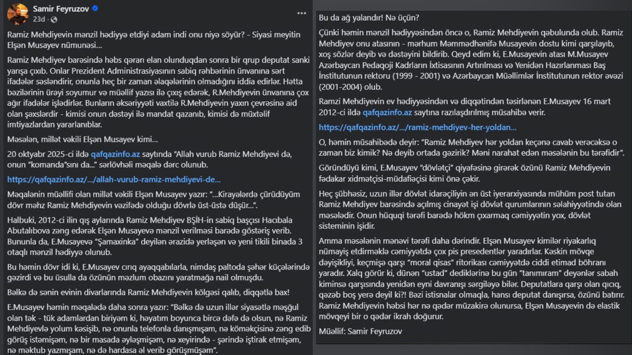 Bizim.Media xəbər verir ki, bu fikirləri “Post TV”nin direktoru, tanınmış jurnalist Samir Feyruzov sosial şəbəkə hesabında yazıb.