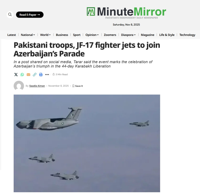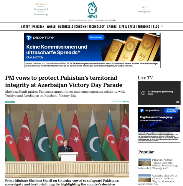 Xəbərlərdə Pakistanın Baş naziri Məhəmməd Şahbaz Şərifin paradda iştirakı xüsusi qeyd olunub, üç qardaş ölkənin ordularının sıx əməkdaşlığı diqqətə çatdırılıb.