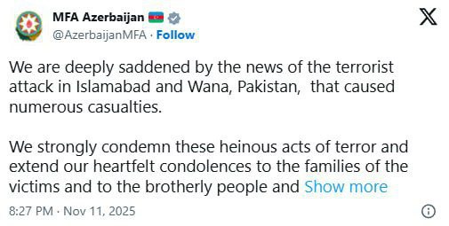 "Bu dəhşətli terror aktlarını qətiyyətlə pisləyir və qurbanların ailələrinə, qardaş Pakistan xalqına və hökumətinə dərin hüznlə başsağlığı veririk. Yaralananların hamısına tezliklə sağalmalarını arzulayırıq.