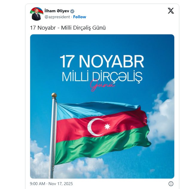 Azərbaycan Respublikasının Prezidenti İlham Əliyev sosial şəbəkə hesablarında 17 Noyabr - Milli Dirçəliş Günü münasibətilə paylaşım edib.
